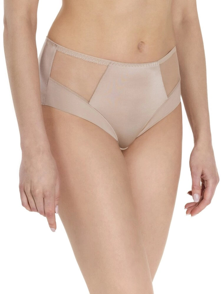 Made from silky elastic fabric and delicate net, they offer a lightweight feel with subtle shaping at the stomach. Comfortable trimming along the leg line ensures a gentle fit that doesn’t dig in. The construction adjusts with size: regular waistline in sizes 36–42 and a higher waistline in sizes 44–52 for added coverage and support where needed.